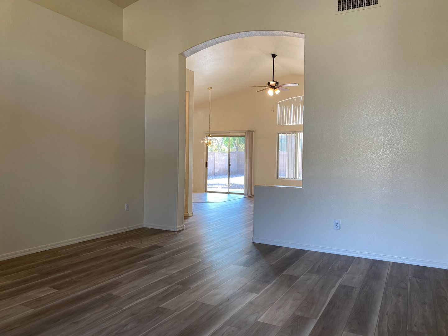 1,620 SqFt - 3 Bed, 2 Bath - Bright and spacious single-level home with open layout, formal living room, and family room with kitchen that flows seamlessly for entertaining. Split floor plan offers a generous primary suite with dual sinks. Interior laundry with hookups and utility sink, plus 2-car garage with electric opener. Enjoy Arizona living with covered patio, north/south exposure, and a large backyard with full landscaping services included. Renters insurance required.