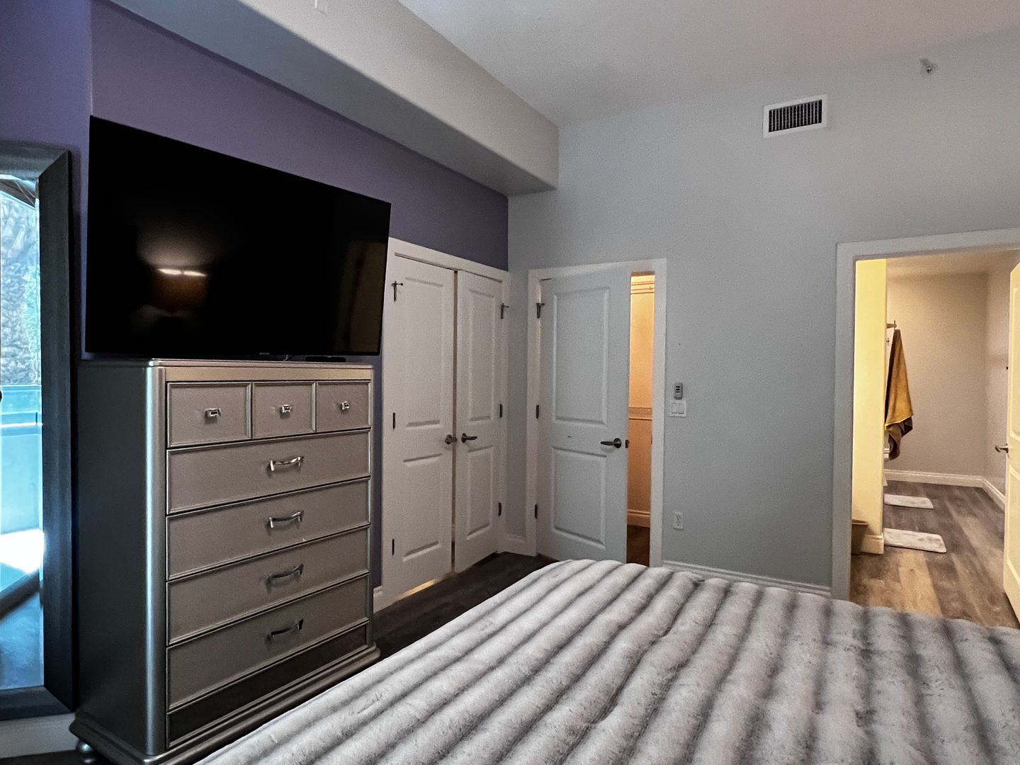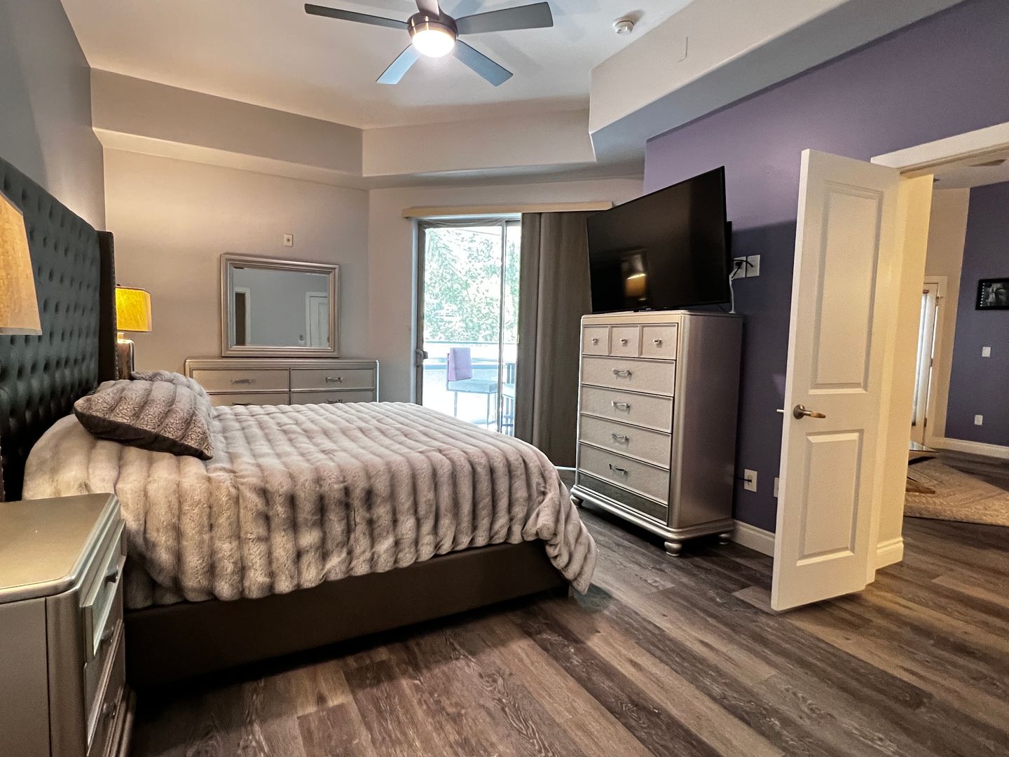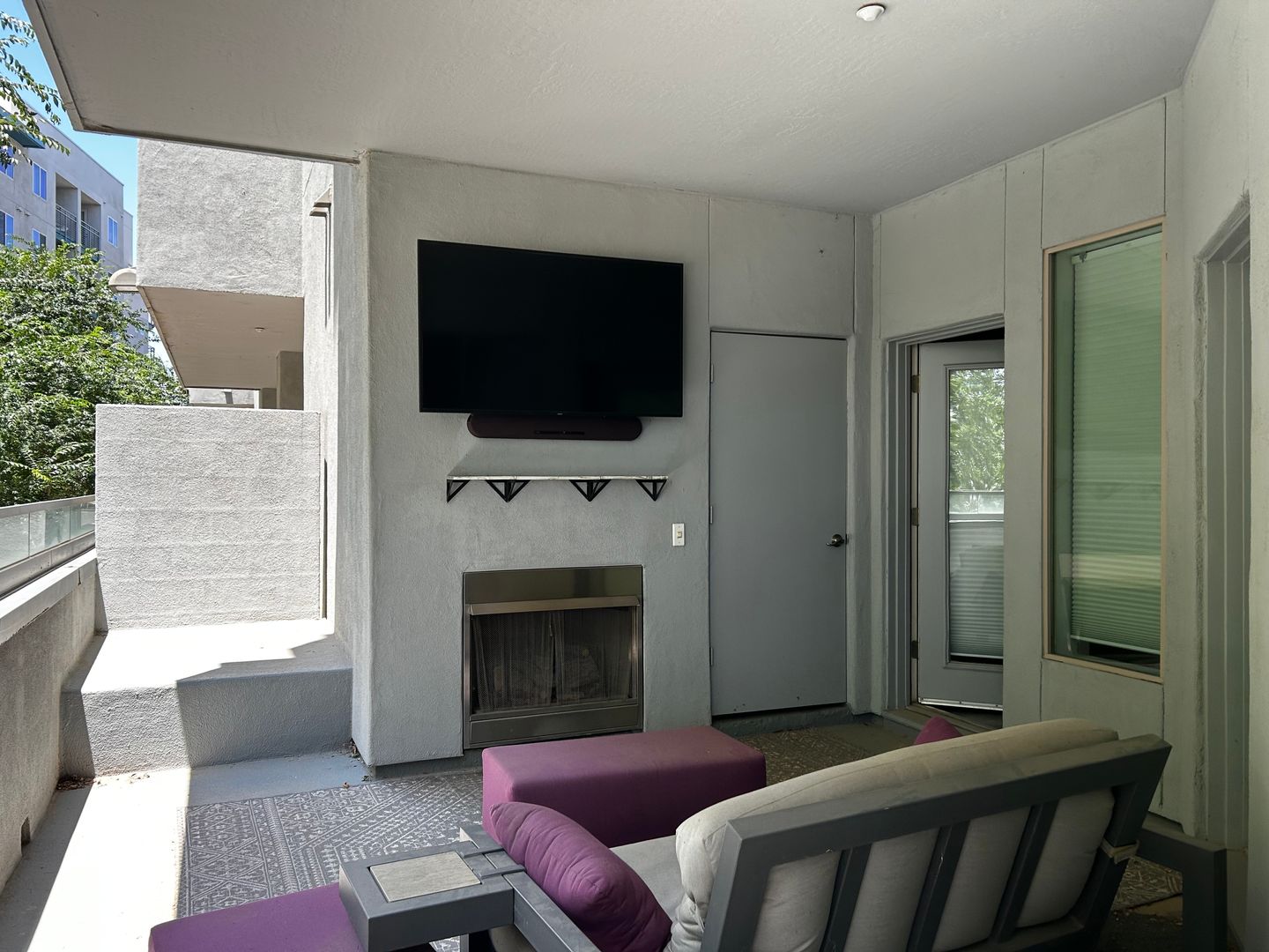 Extended patio with fireplace + balcony access from both bedrooms