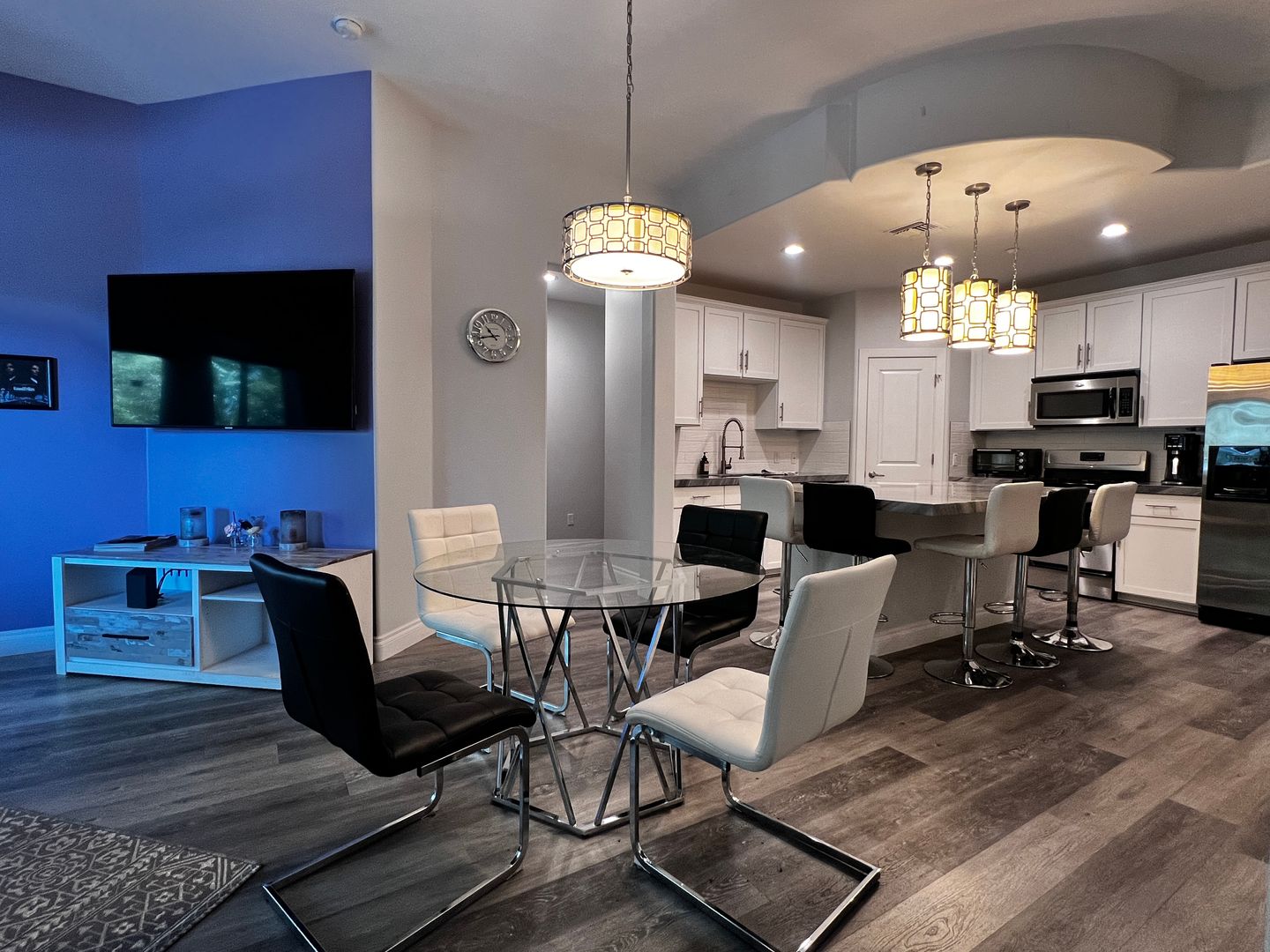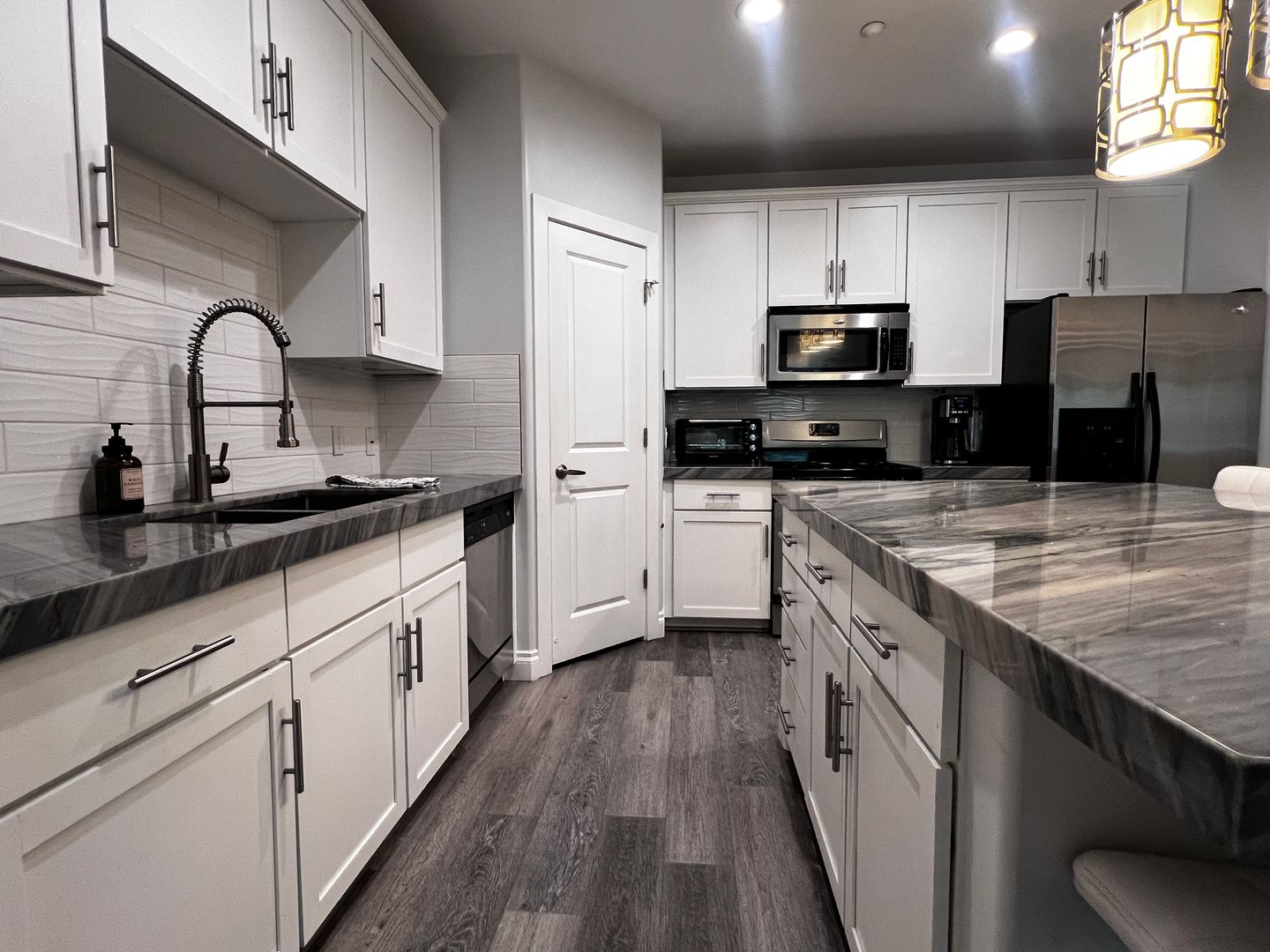Modern kitchen with island, breakfast bar, walk-in pantry, and gas appliances